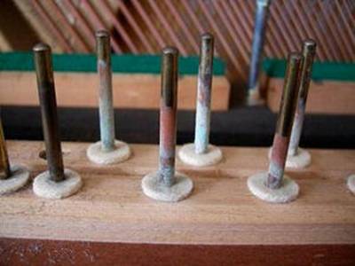 それ以外にも、鍵盤の支点となるピンや、ハンマーの軸となるピンなど、重要な可動部分にはたくさん金属がつかわれています。