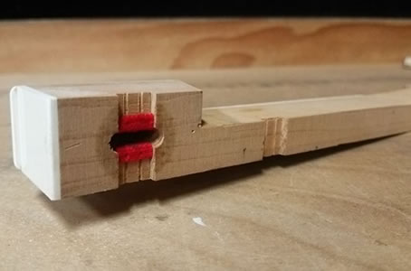 下の写真は鍵盤を下から見た写真ですが、赤い部分がフェルトで、このフェルトのところにピンがささって鍵盤が左右にぶれ過ぎないように、通常はなっています。