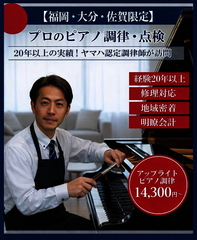 ■経歴 ヤマハピアノテクニカルアカデミー卒業 ヤマハアップライトピアノ認定技術者 ヤマハグランドピアノ認定技術者 ヤマハ電気音響製品認定技術者 ■ 大切なピアノ、こんな「困った」ありませんか? 「最近、音の高さがバラバラな気がする…」 「鍵盤の動きが重くて弾きにくい」 「実家のピアノを譲り受けたけれど、どこに頼めばいいかわからない」 ピアノは非常に繊細な楽器です。湿度や気温の変化で、状態は刻一刻と変わります。 私は「ただ音を合わせるだけ」ではありません。ピアノの寿命を延ばし、本来の輝きを取り戻すためのトータルメンテナンスをお届けします。 ■ 選ばれる3つの理由 【1】20年の現場経験と確かなライセンス ヤマハピアノテクニカルアカデミーを卒業後、20年間一貫してピアノの再生・修理・調律に従事してきました 。数多くのピアノを蘇らせてきた技術で、あなたのピアノを最適な状態へ導きます 。 【2】「その場で直せる」高い修理技術 調律だけでなく、内部アクションの調整や外装の修理・研磨も得意としています 。ちょっとした不具合ならその場で対応可能なため、お客様の「困った」をスピーディーに解決します 。 【3】教育機関からも信頼される誠実な対応 地元の保育園から高校まで、長年学校のピアノメンテナンスを任されてきた実績があります 。初めての方も、どうぞ安心してお任せください。 ■サービス内容 作業内容: 調律、内部清掃、タッチ調整、簡易修理の診断 所要時間: 約2時間~3時間程度(状態により前後します) 【重要】お申し込み前に必ずご確認ください ピアノの状態によっては、当日その場での作業が困難な場合がございます。あらかじめご了承ください。 ※特殊なケースへの対応について ネズミ害、水害、著しい部品の欠損など、その場での調律・修理が不可能な場合がございます。 ※追加料金のご説明 ピアノの状態が著しく悪い場合、基本料金以外に別途修理・調整費用がかかることがございます。 その際は必ず事前に状態をご説明し、作業内容と費用にご納得いただいた上で着手いたします。 勝手に追加作業を行い、後から高額な請求をすることは一切ございません。 ※キャンセル料について 現地訪問後、状態により作業が不可能と判断された場合や、お見積りにご納得いただけずキャンセルとなった場合は、交通費・診断料として一律3,300円(税込)を申し受けます。 |